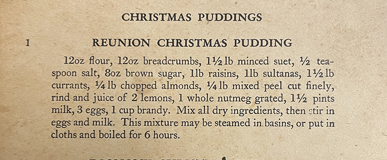 In the unlikely event you would like to cook a goose (or a gannet) we have a recipe for this in our cookbook collection but maybe Christmas pudding is more to your taste. Here’s a Kiwi recipe from 365 Puddings; One for Every Day of the Year. (How is it people used to always have a dessert with dinner and didn’t get fat?) There’s no mention of the threepences that were typically stirred into the pudding to delight children (and probably dentists).